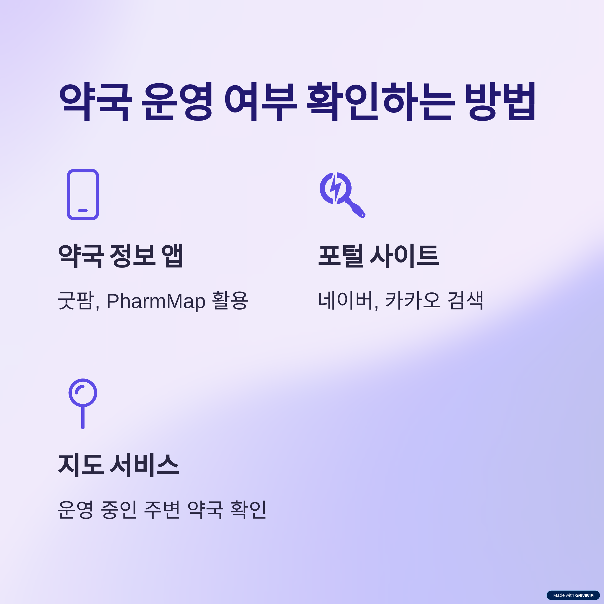 '약국 찾기' 기능을 활용하여 근처 운영 중인 약국을 찾아보세요.