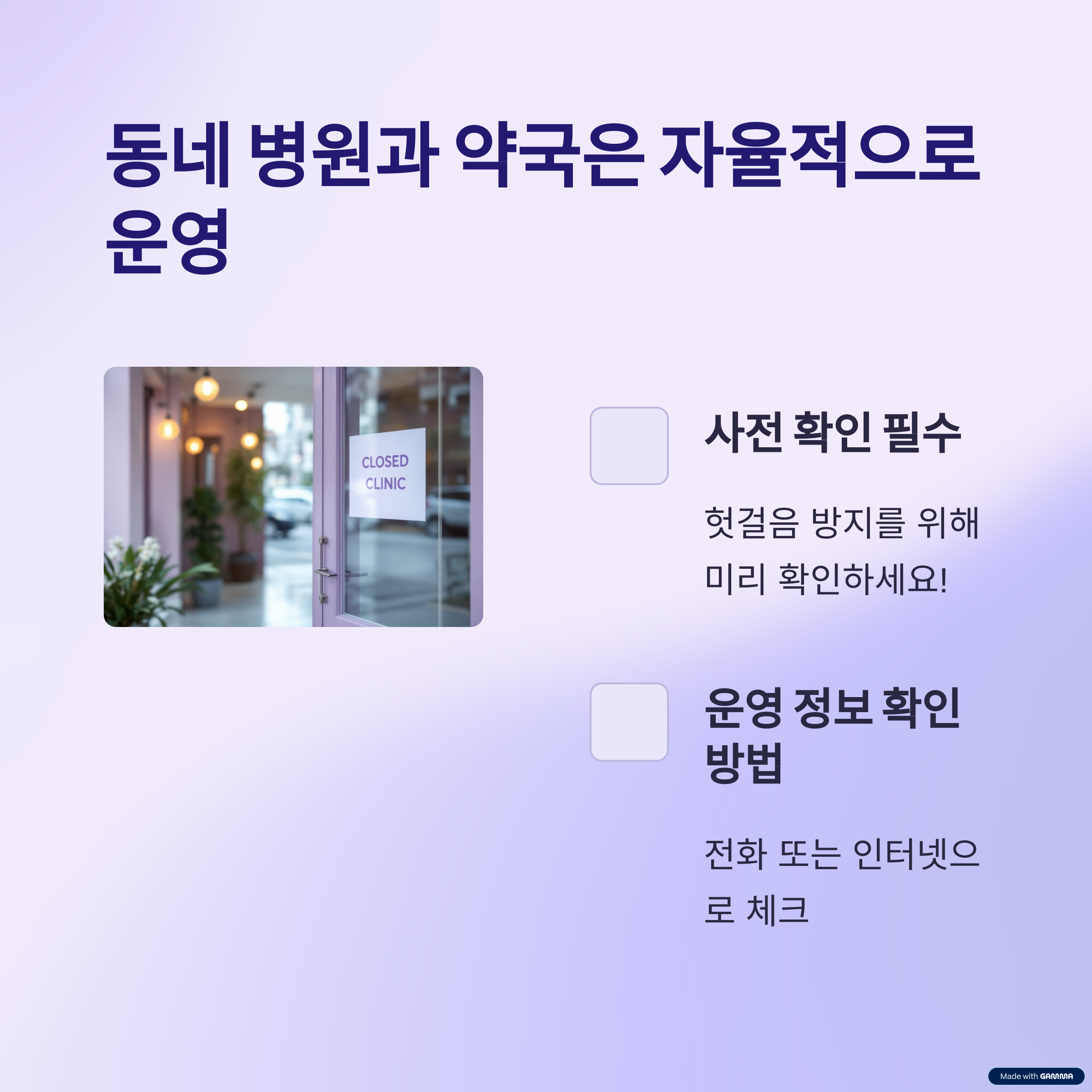 - 사전에 병원과 약국 운영 여부 확인
