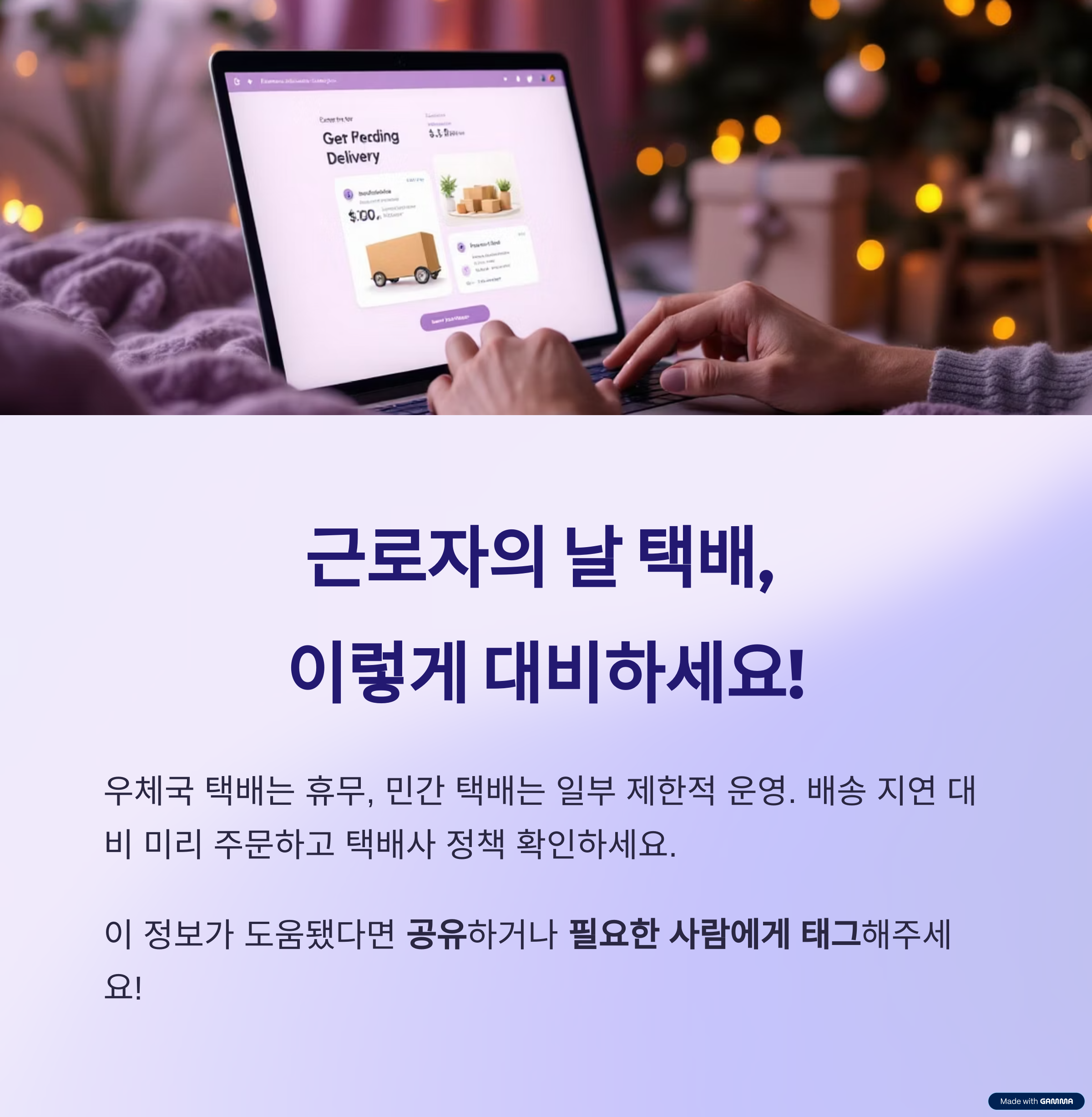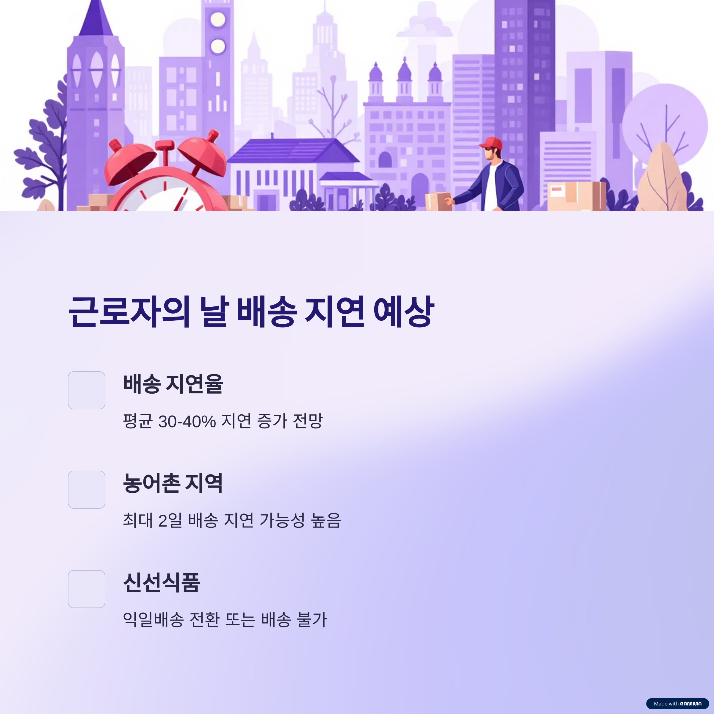 근로자의 날에는 일부 택배기사의 휴무나 물량 증가로 인해 배송이 지연될 수 있습니다. 특히, 전날과 당일에 주문이 몰리는 경우 이러한 현상이 두드러질 수 있으므로, 중요한 물품은 미리 주문하시는 것이 좋습니다.