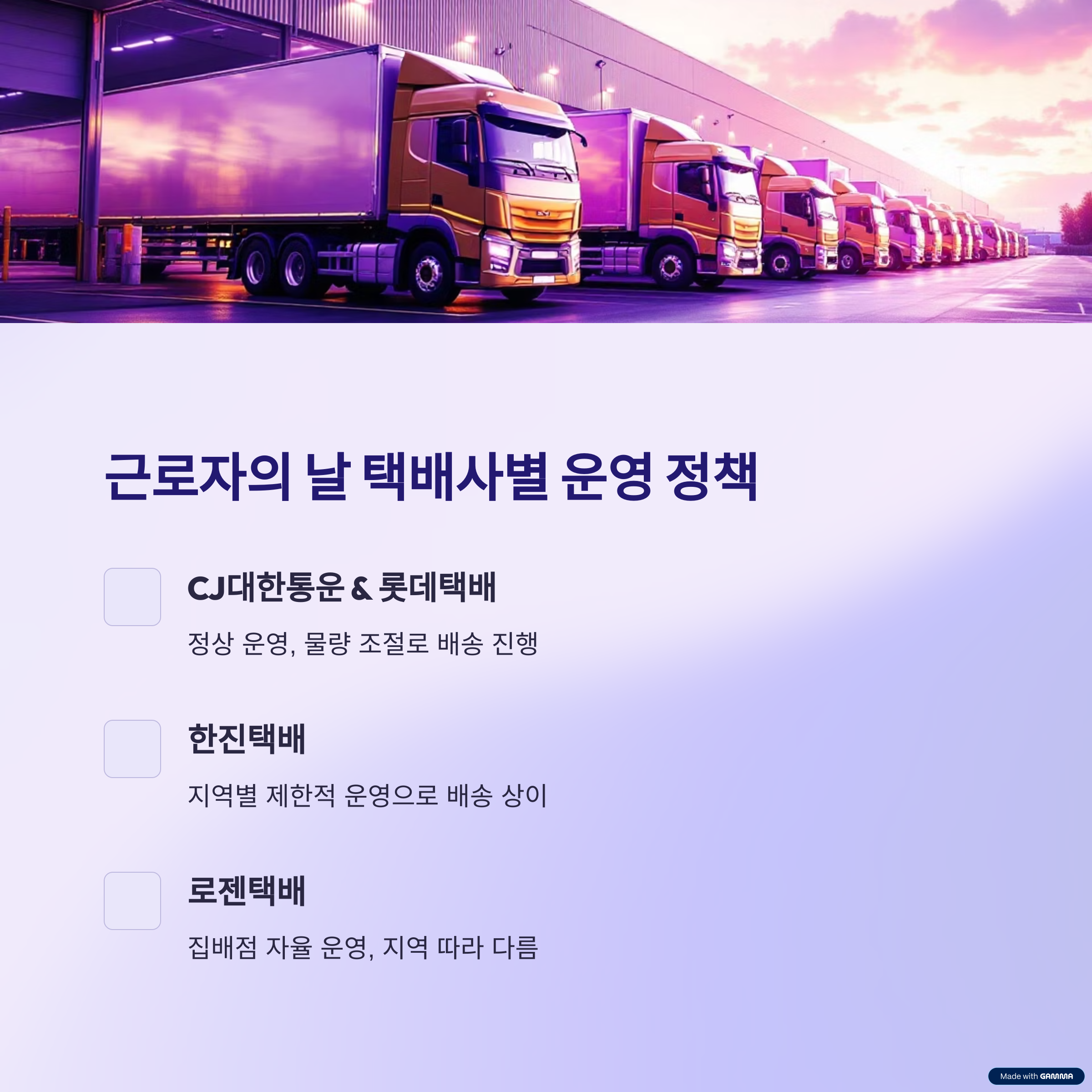 CJ대한통운, 한진택배, 롯데택배 등 주요 택배사는 근로자의 날에도 정상적으로 배송 업무를 진행합니다. 다만, 일부 지역이나 상황에 따라 배송 일정이 조정될 수 있으므로, 해당 택배사의 공지사항을 확인하는 것이 좋습니다.