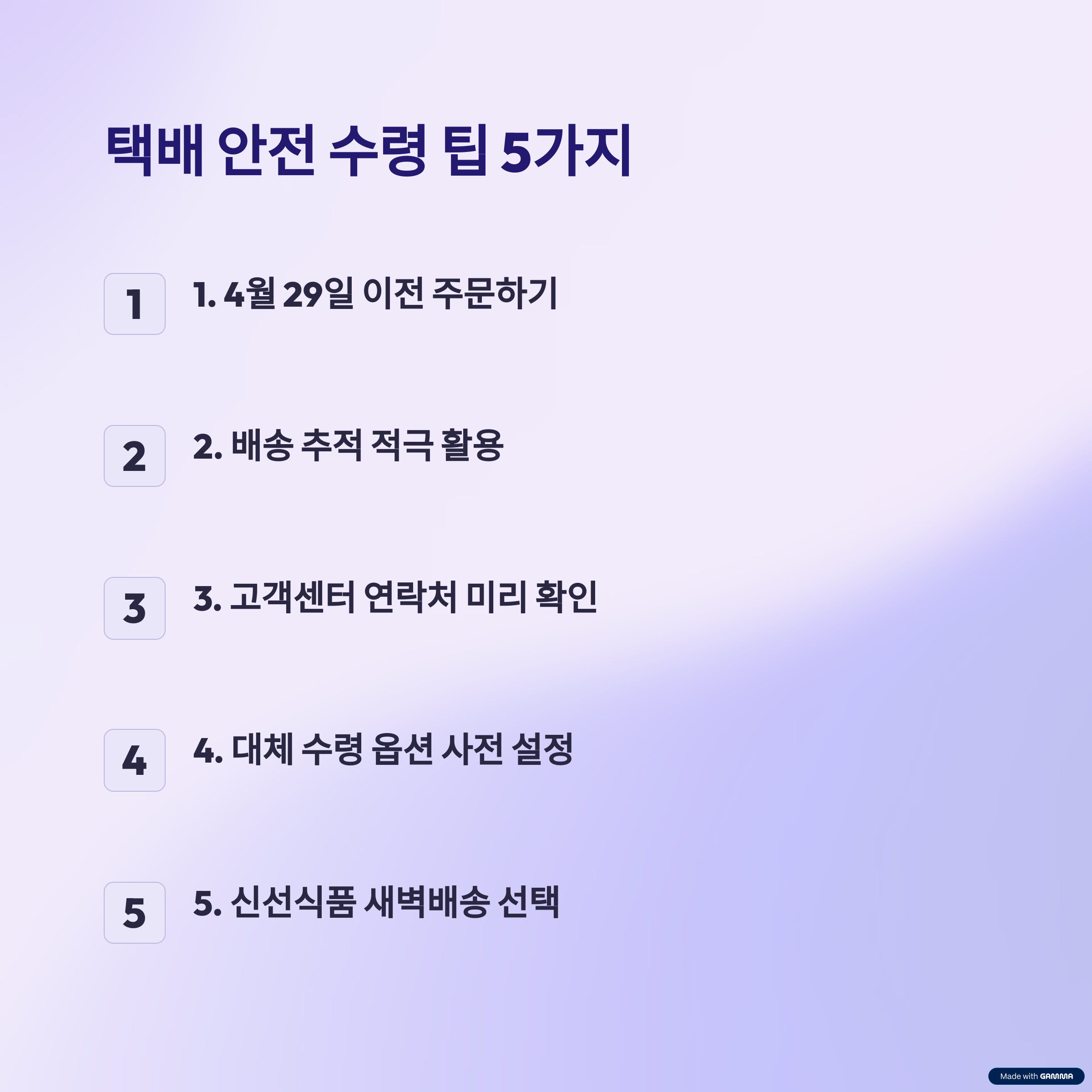 근로자의 날에는 택배 물량이 증가할 수 있으므로, 배송 주소와 연락처를 정확하게 기재하시고, 부재 시 수령 가능한 장소를 미리 지정해두는 것이 좋습니다. 또한, 배송 추적 서비스를 활용하여 배송 현황을 수시로 확인하시기 바랍니다.