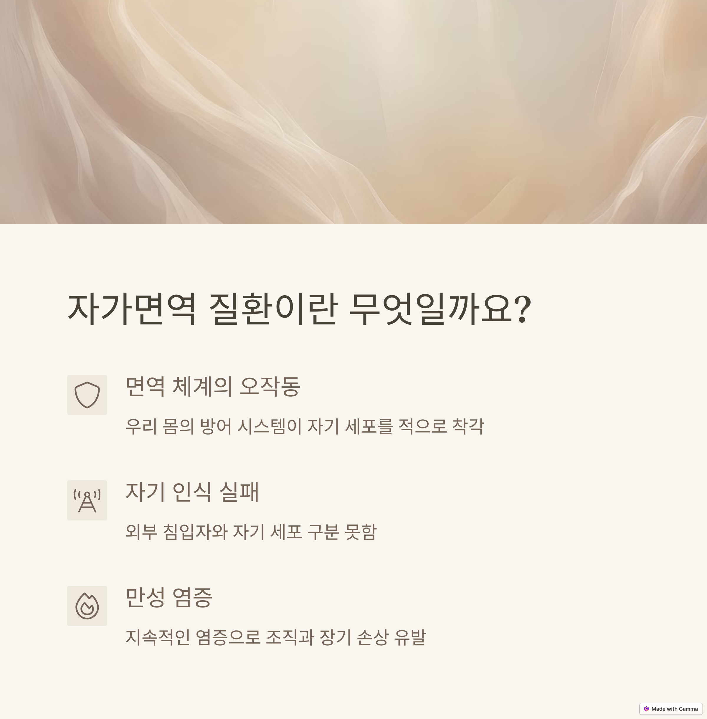 최근 건강에 관심 있는 사람들이라면 한 번쯤 들어봤을 자가면역이라는 단어, 단순히 병명으로 넘기기에는 너무나도 복합적이고 실생활과 밀접한 문제입니다. 아무 이유 없이 계속되는 피로, 반복되는 관절 통증과 소화 장애, 그리고 눈에 띄는 피부 트러블까지. 이런 신호들을 무시하면 내 몸은 결국 나를 향해 공격을 시작하게 됩니다. 자가면역 질환은 면역 시스템이 적과 아군을 구분하지 못해 스스로의 몸을 공격하는 현상으로, 그 원인은 한 가지가 아니라 식습관, 장 건강, 수면, 스트레스 등 다양한 요소가 복합적으로 작용합니다. 하지만 희망은 있습니다. 몸이 보내는 신호에 귀 기울이고, 일상의 작은 루틴부터 차근차근 바꿔간다면 자가면역도 충분히 조절 가능한 대상이 될 수 있습니다. 이 글을 통해 자가면역의 진짜 원인을 이해하고, 나를 지키는 방법을 함께 배워보세요.