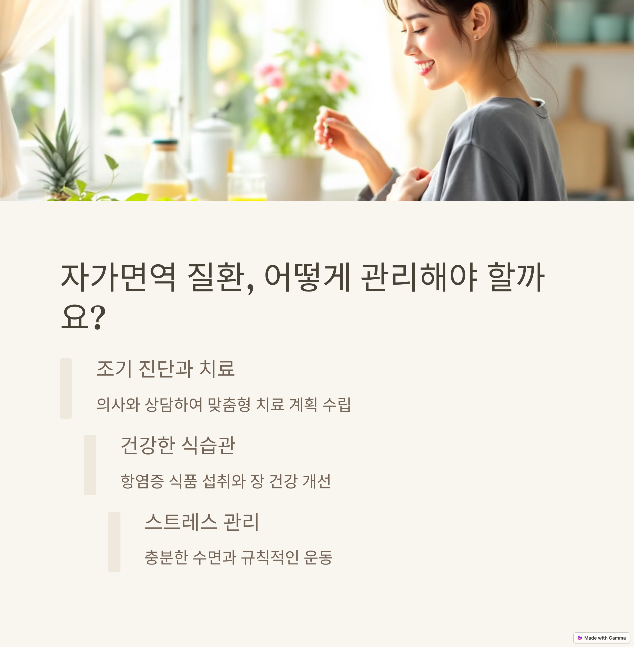 자가면역을 극복하기 위한 가장 기본적이면서도 효과적인 방법은 바로 식습관, 수면, 스트레스 관리입니다. 항염증 식단과 규칙적인 수면 습관, 그리고 일상 속 간단한 명상이나 심호흡만으로도 면역계는 안정감을 되찾기 시작합니다. 이러한 루틴은 꾸준히 실천할 때 가장 큰 효과를 보이며, 일상의 작은 변화가 결국 삶 전체의 균형을 만들어냅니다.