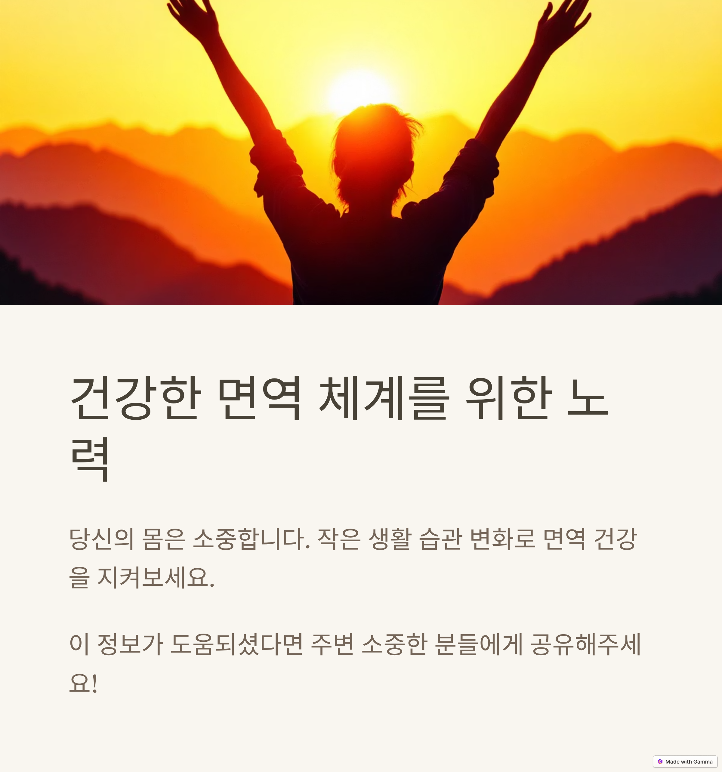 자가면역 질환은 단순한 의학적 개념을 넘어, 일상의 균형과 몸의 신호를 이해하고 실천으로 연결해야 하는 삶의 과제입니다. 꾸준한 식단 조절, 수면 습관, 스트레스 관리, 심리적 안정 등 복합적인 생활 요소가 면역계의 안정에 영향을 줍니다. 자신의 몸을 제대로 이해하고 돌보는 태도는 병을 이겨내는 가장 강력한 치료법이 될 수 있습니다. 이 글을 읽는 지금 이 순간부터, 몸과 마음을 위한 작은 실천을 시작해보세요. 자가면역은 두려움이 아닌 변화의 출발점이 될 수 있습니다.