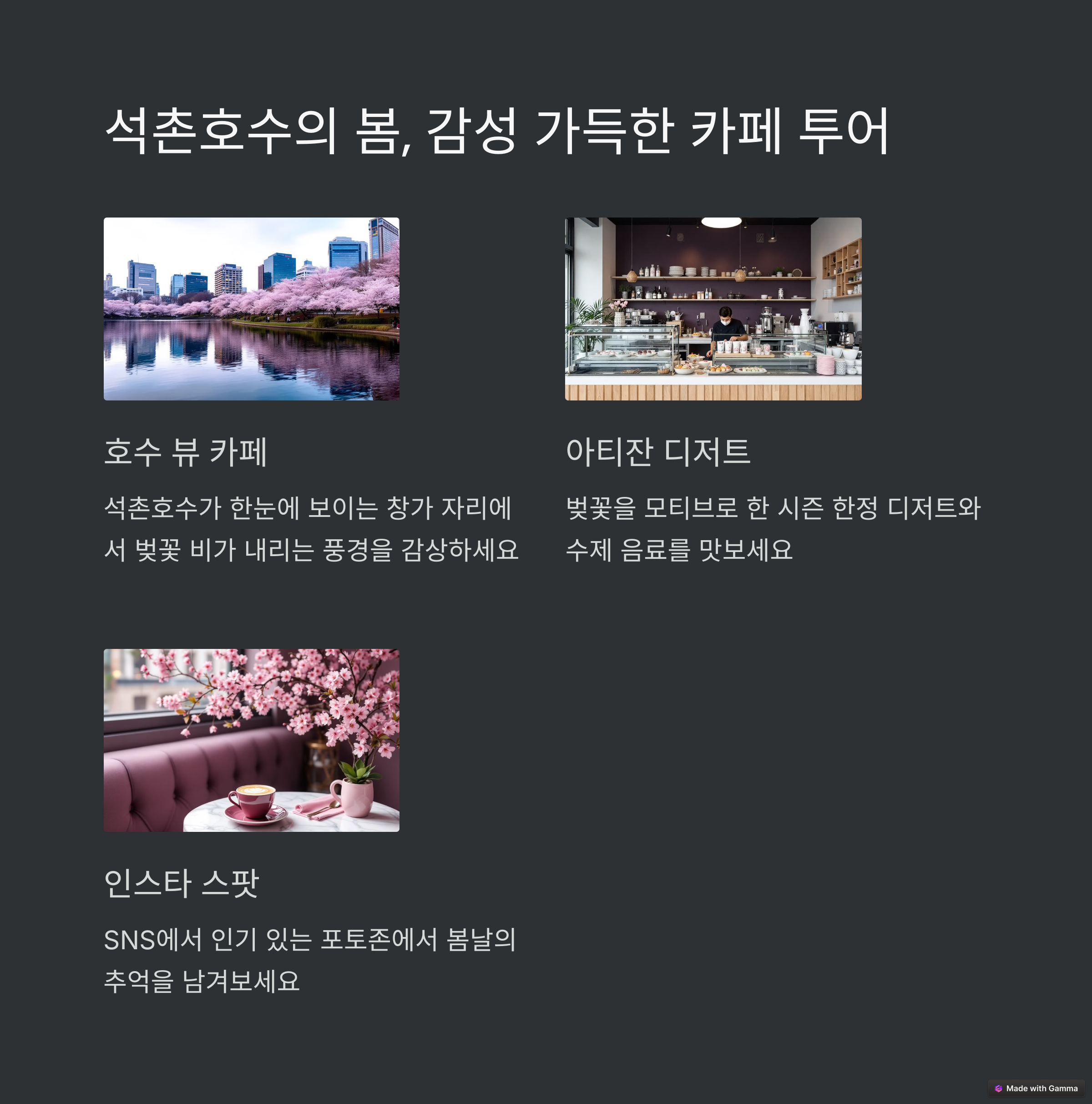 - 카페 드롭탑 석촌호수점: 호수를 바라보며 커피를 마실 수 있는 명당 자리. 봄에는 테라스석이 인기 많으니 일찍 가는 것을 추천합니다.