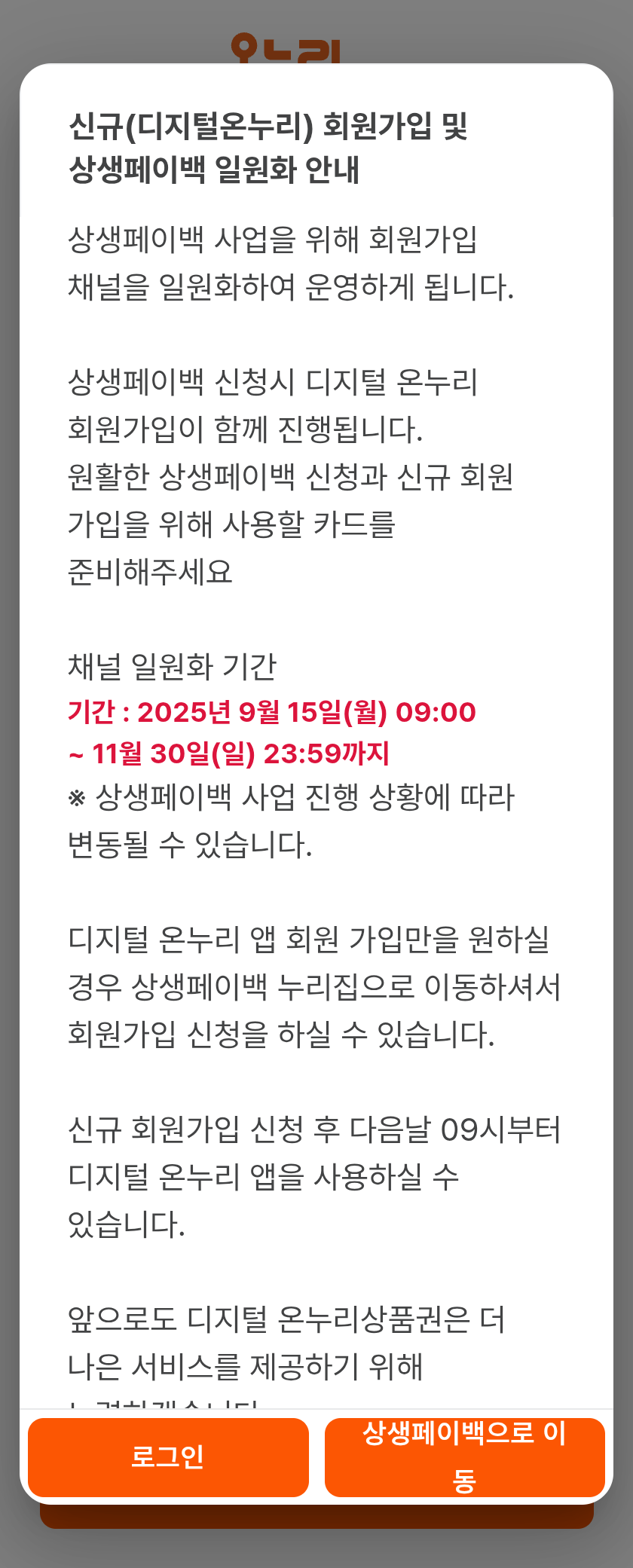 온누리앱은 상생페이백 신청 시 자동으로 회원가입 처리됩니다.