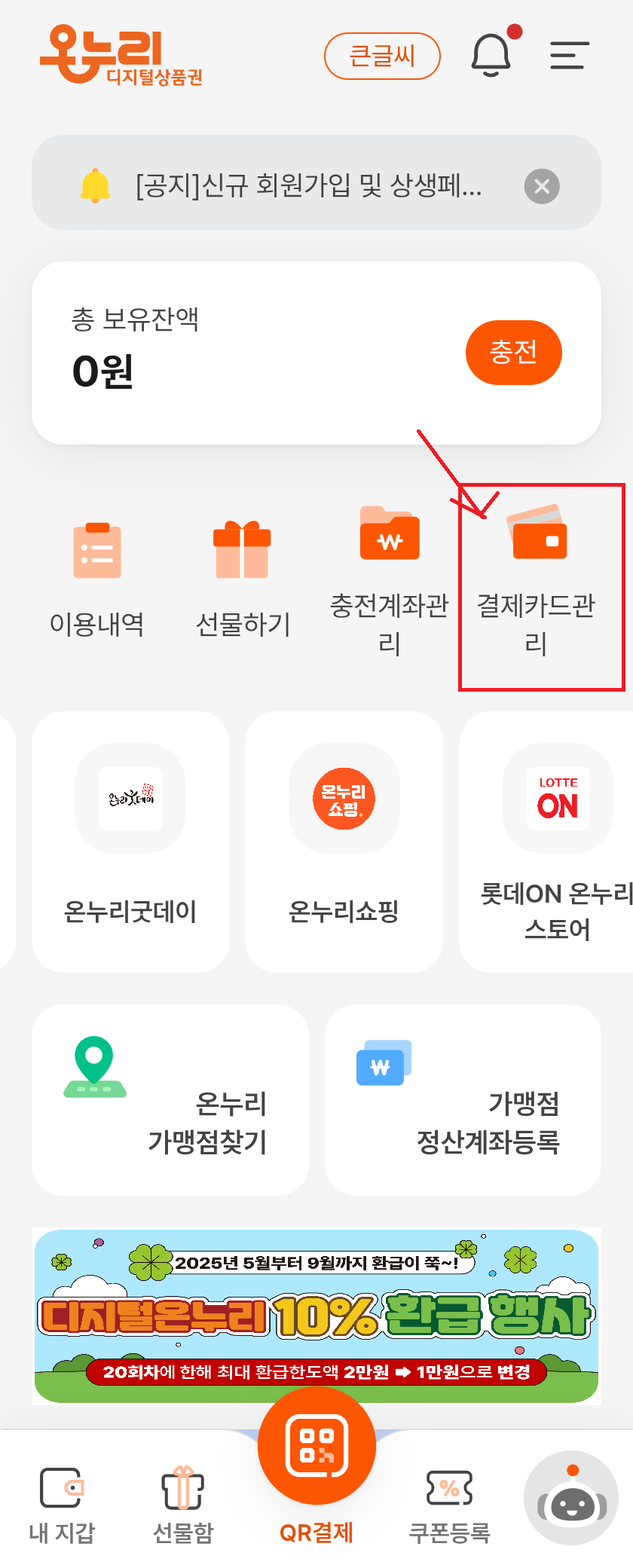 02. 디지털온누리앱 로그인 후 하단 메뉴에서 ‘내 지갑’ 또는 충전 버튼 아래의 ‘결제카드 관리’ 메뉴를 누르세요.