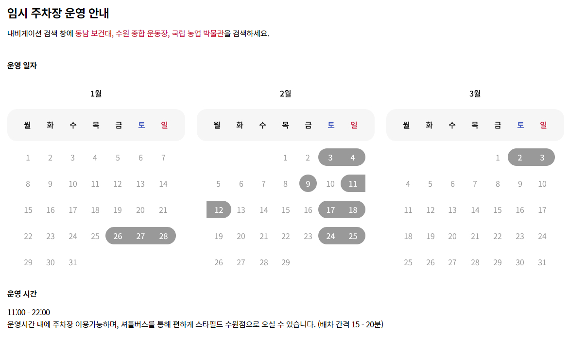 스타필드 수원점 오픈 초반 혼잡도를 고려하여 임시 주차장을 운영하고 있습니다.