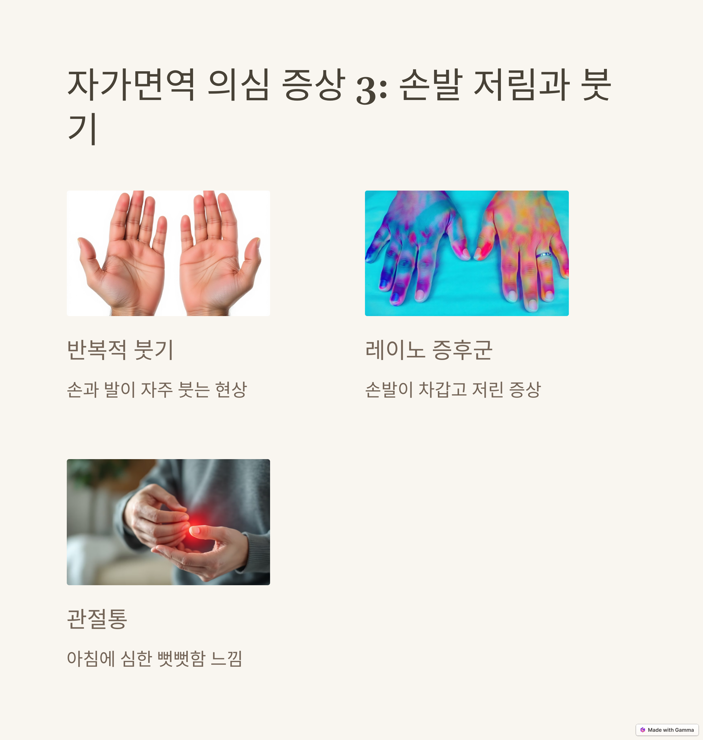눈에 잘 띄지 않지만 점점 누적되는 체내 염증 역시 자가면역 질환의 주요 신호입니다. 잇몸이 자주 붓거나, 장이 예민해지고 설사와 변비가 반복되는 증상, 관절이 이유 없이 뻣뻣해지는 느낌 등이 이에 해당합니다. 특히 아침에 일어났을 때 손가락이 잘 안 움직이거나 근육통처럼 뻐근한 느낌이 반복된다면 단순한 피로가 아니라 염증 반응일 수 있습니다. 작지만 반복되는 증상들을 간과하지 말고 일상 속에서 변화를 기록하고 관찰하는 습관이 필요합니다.