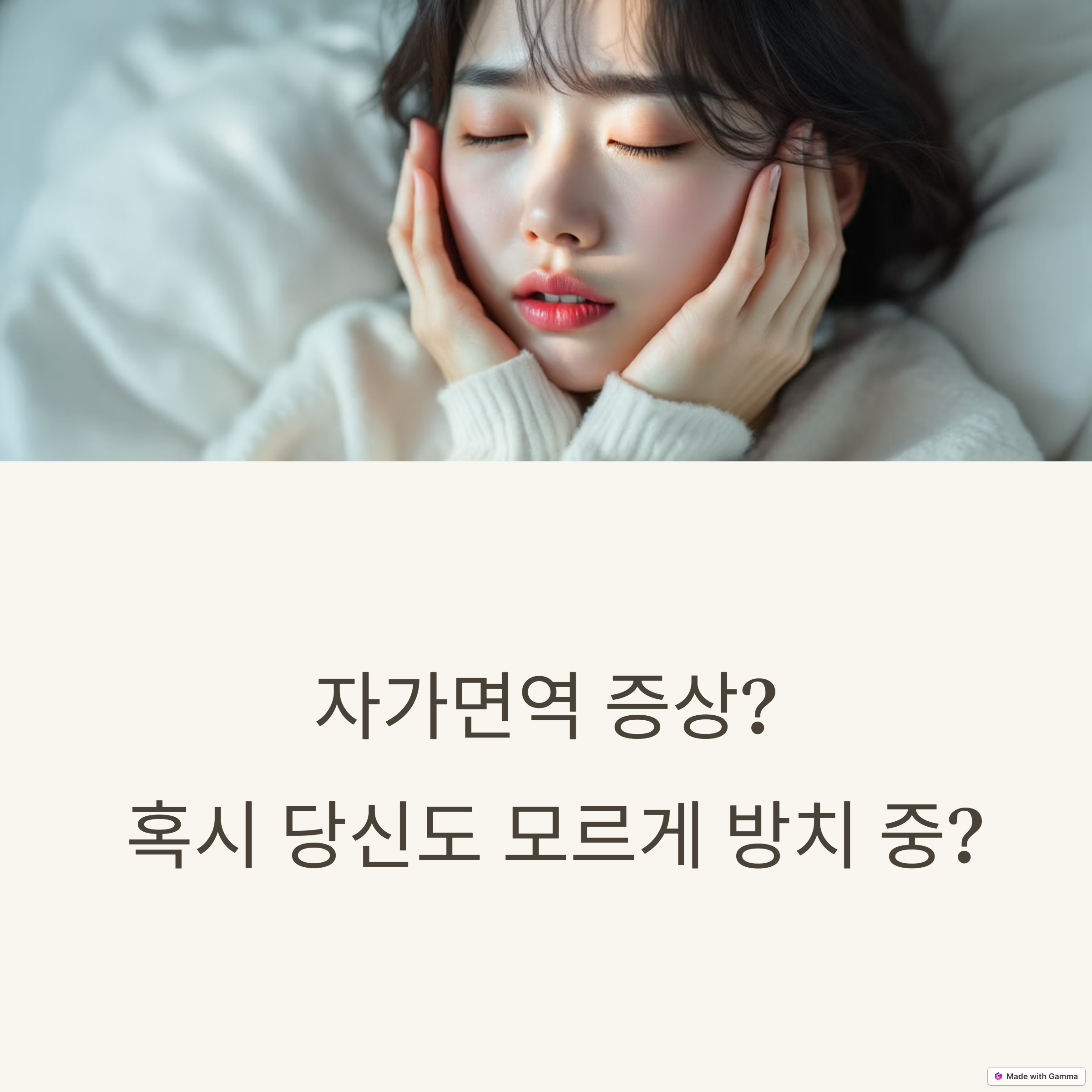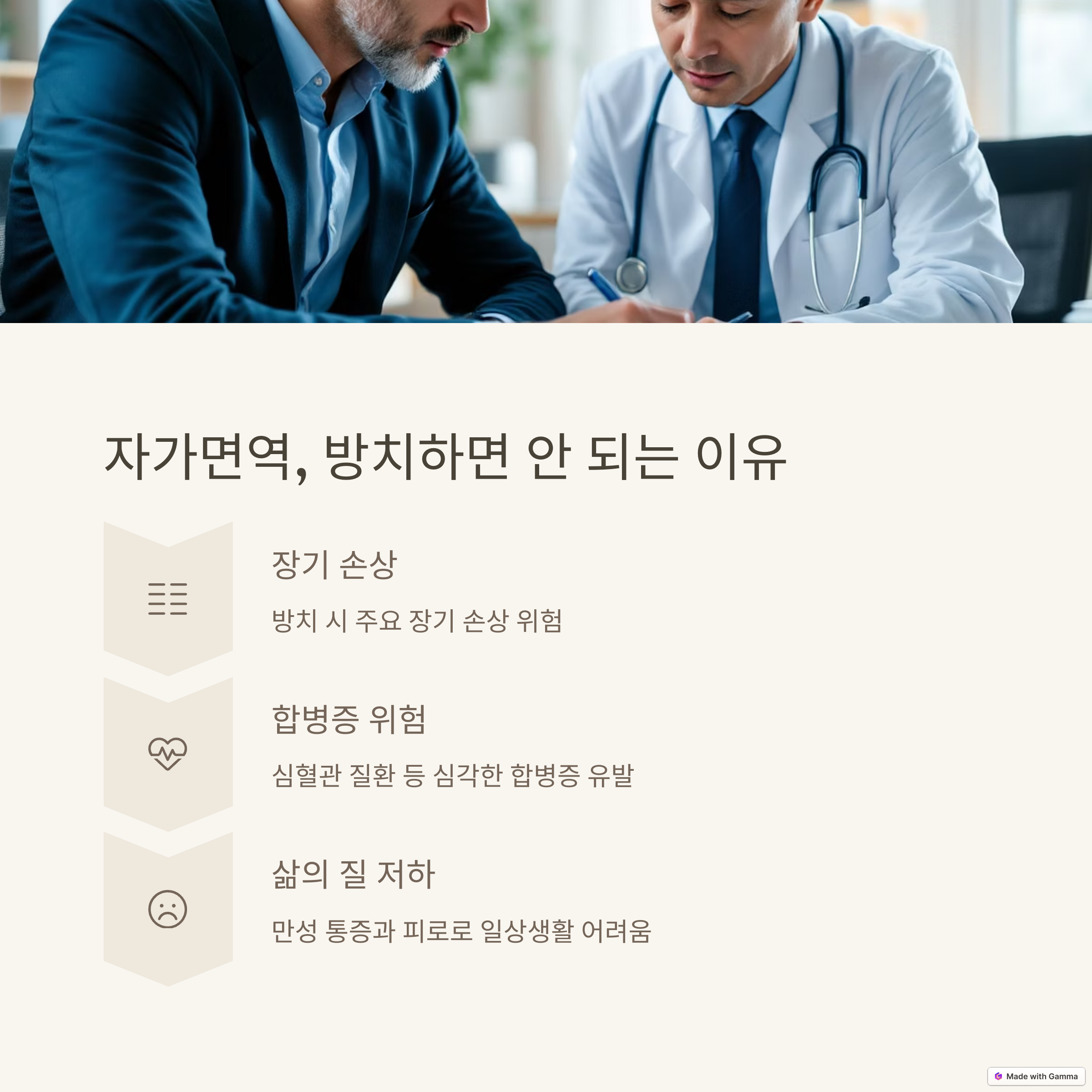 자가면역 질환은 오랜 기간 방치될 경우 일상생활에 큰 불편을 초래할 수 있습니다. 증상이 미미하다고 무시하기보다는 작은 신호에 민감하게 반응하고, 기록과 관찰을 통해 자신의 몸 상태를 객관적으로 파악하는 노력이 필요합니다. 초기에는 생활습관의 변화만으로도 충분히 건강을 되찾을 수 있습니다. 지금부터라도 피로감, 염증 반응, 소화 이상 등 작은 증상들을 점검해보고 필요하다면 꼭 전문 진료를 받아보세요. 건강은 누가 대신 지켜주지 않습니다. 오늘의 선택이 내일의 건강을 좌우합니다.