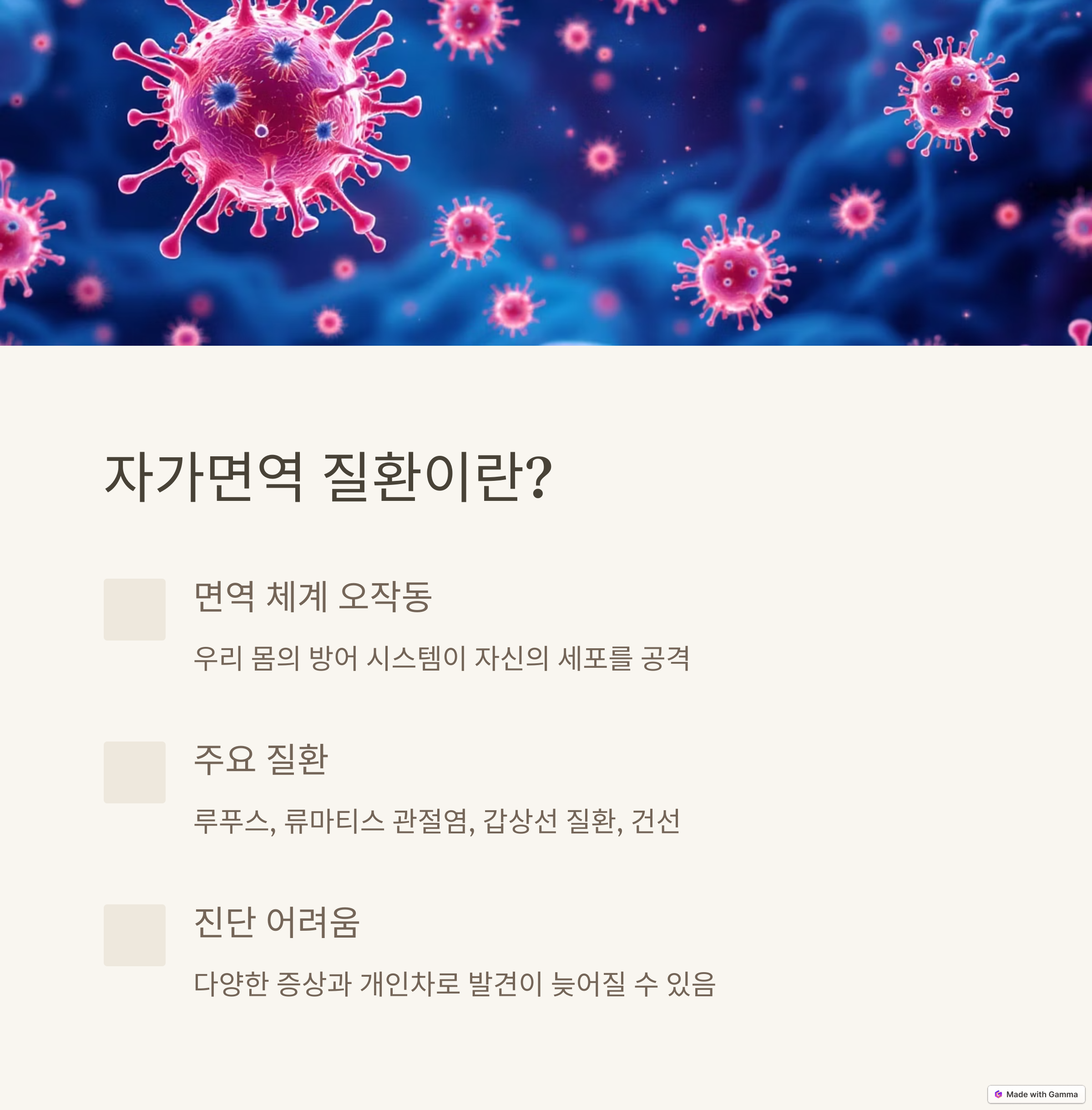 | 자가면역 질환이란? | 면역 체계가 자기 세포를 공격하는 질환입니다. |