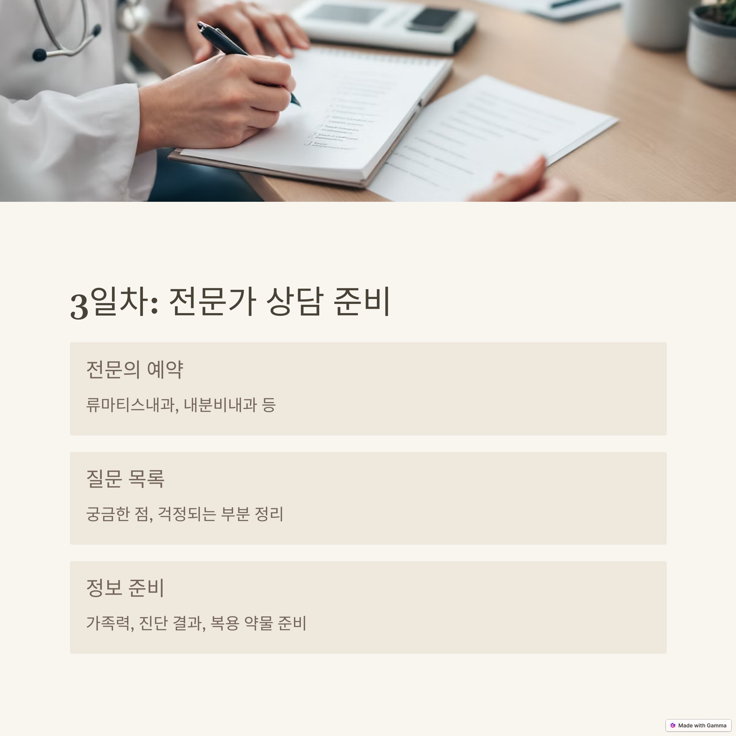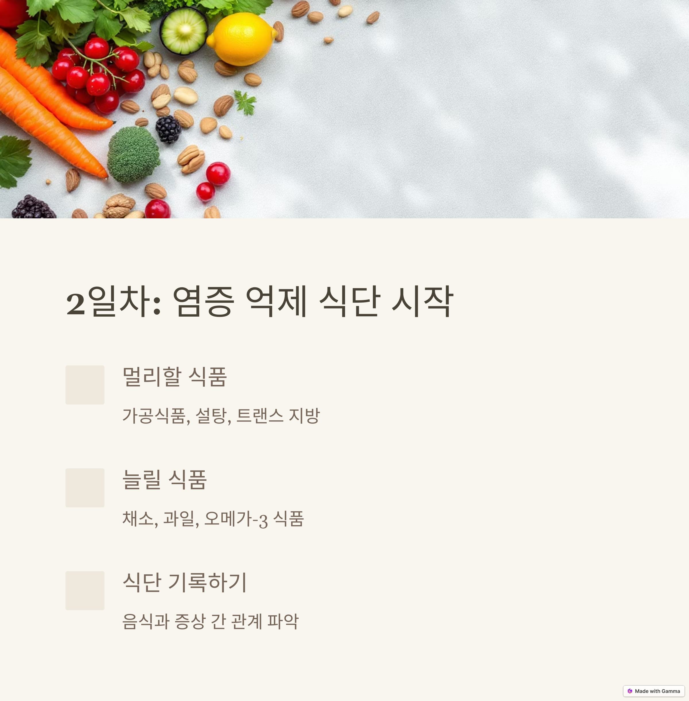 | 진단 후 첫 7일은 계획과 루틴 설계의 핵심 시기입니다 | 채소, 통곡물, 생선, 견과류 중심으로 식단을 바꿉니다 | 스트레스는 자가면역 질환에 큰 영향을 미칩니다 |