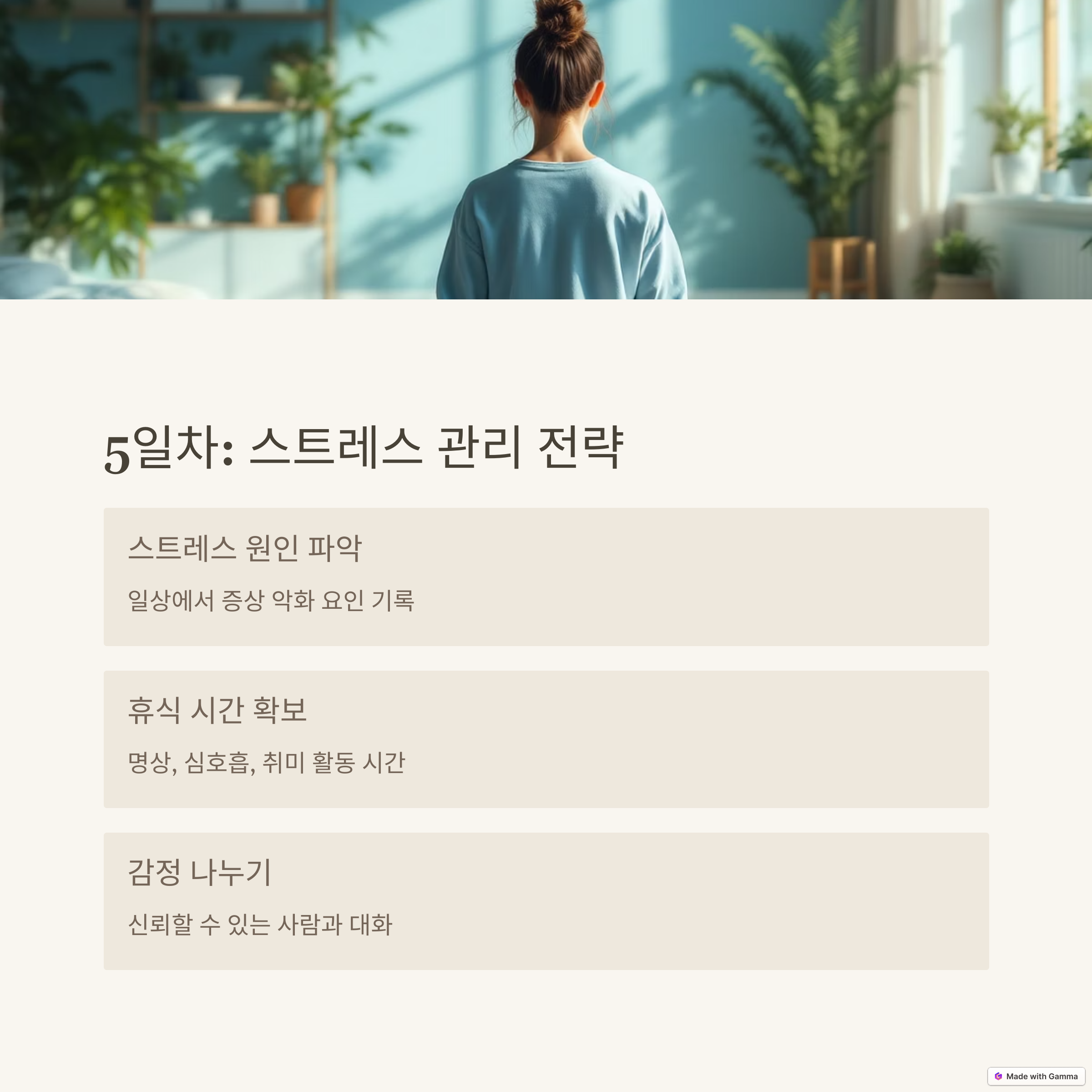 | 정보 습득과 감정 정리를 통해 안정적 대응을 시작합니다 | 염증 유발 식품은 줄이고 항산화 식품으로 구성합니다 | 숙면 환경과 명상 루틴으로 면역 안정에 도움을 줍니다 |