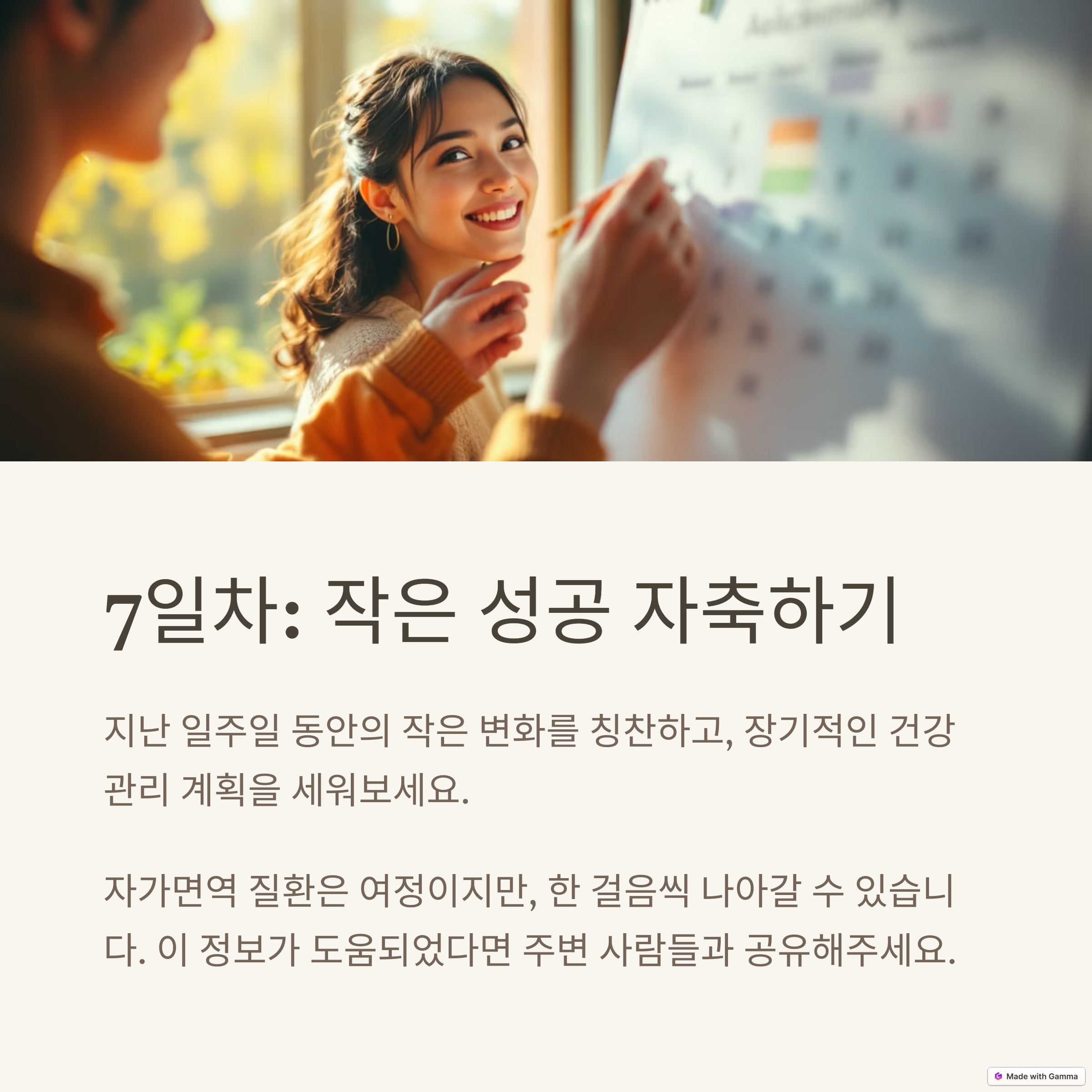 자가면역 질환은 단기간에 완전히 회복되기 어려운 만성 질환입니다. 그렇기 때문에 이 질환을 마주했을 때 중요한 것은 ‘꾸준함’입니다. 하루하루 쌓아가는 생활 루틴은 결국 나의 면역력을 안정화하고 삶의 질을 높이는 결정적 요소로 작용합니다. 오늘 실천한 하나의 루틴이 내일을 조금 더 나아지게 합니다. 일곱 날의 정성과 노력이 결국은 평생 건강을 바꾸는 터닝포인트가 될 수 있습니다.