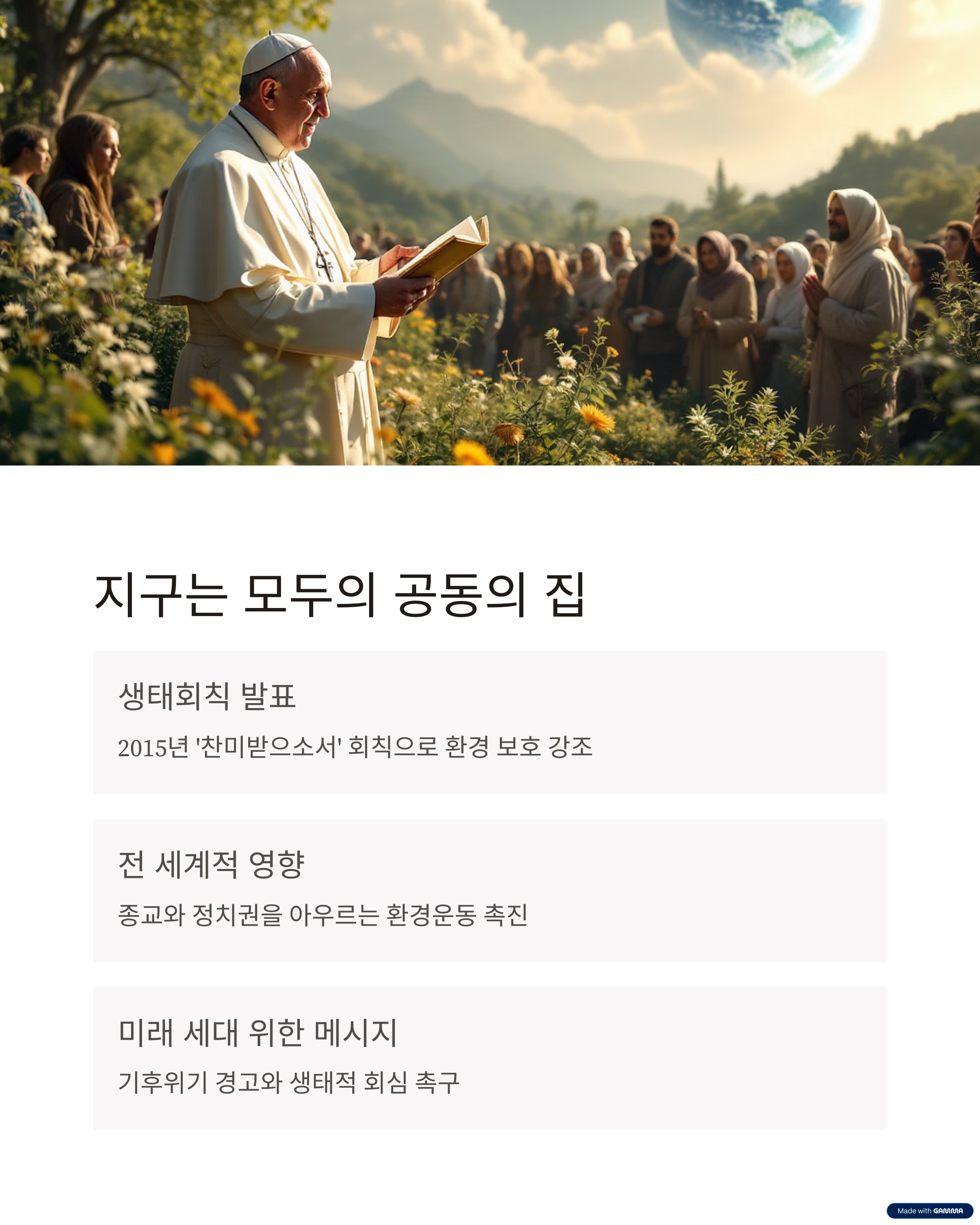 그는 "지구는 우리의 공동의 집이며, 가장 약한 이들이 가장 먼저 고통받는다"고 강조했습니다.