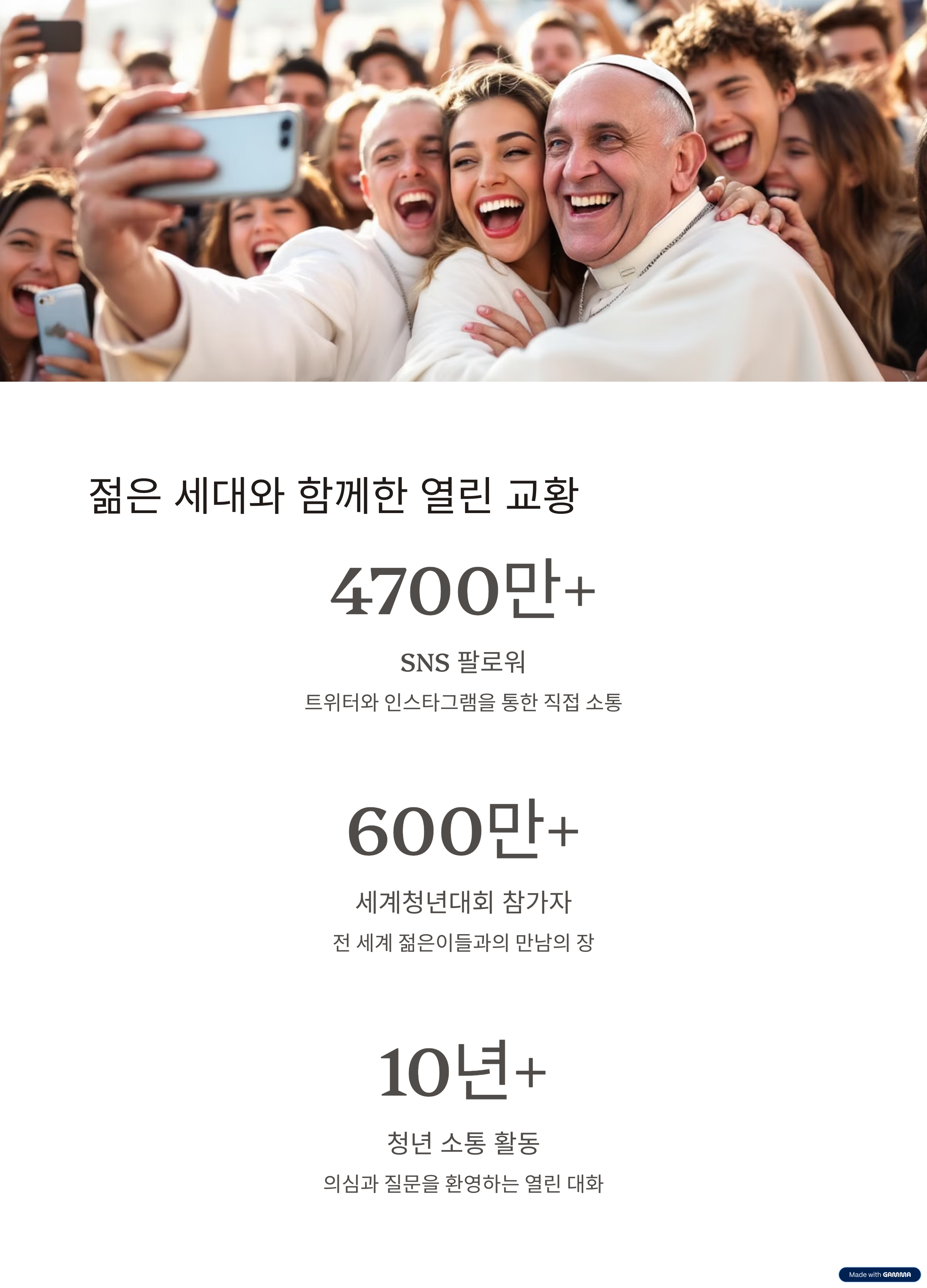 수백만 명의 청년과 직접 만나 웃고, 안아주고, 질문에 답했습니다.