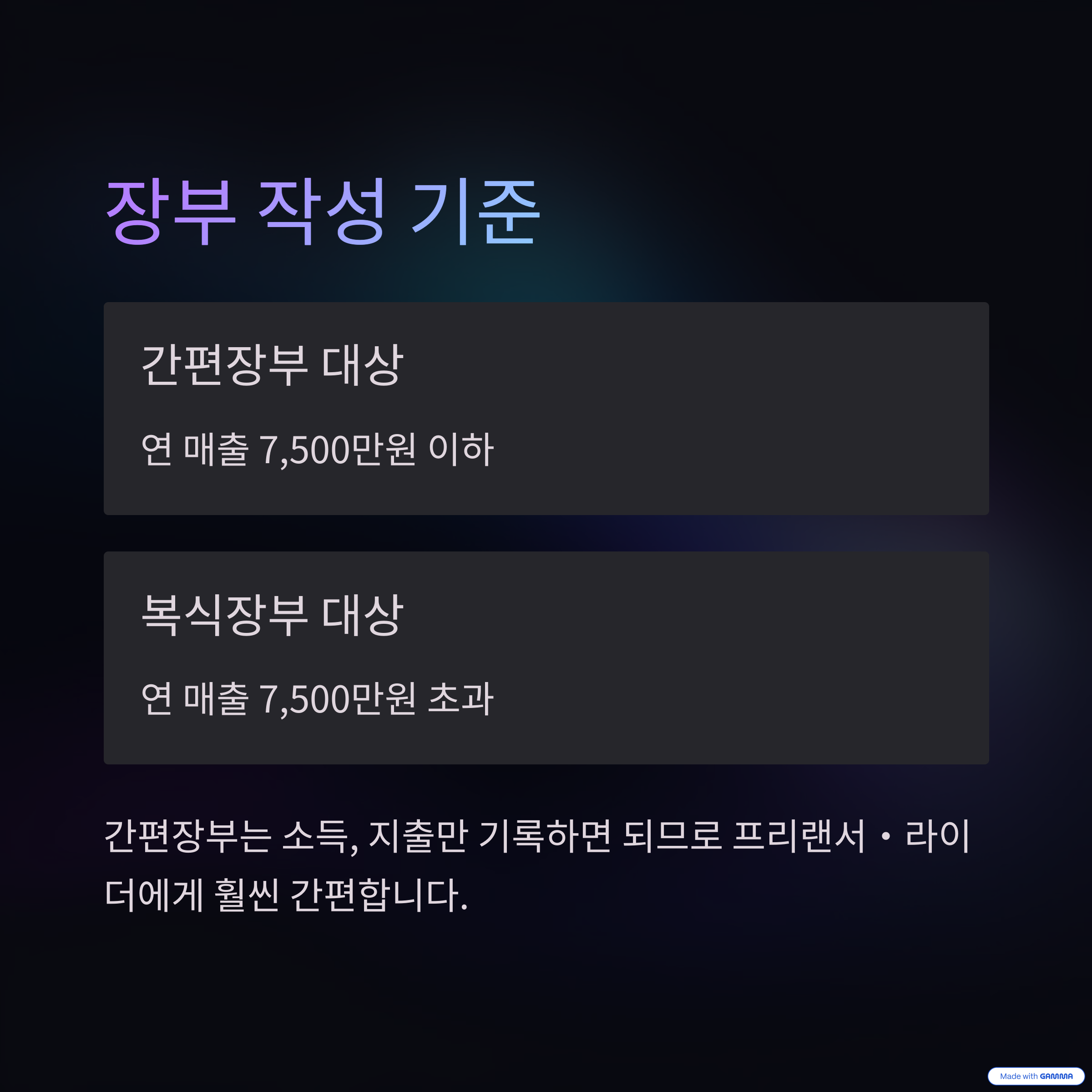 - 연 매출 7,500만원 이하: 간편장부 대상