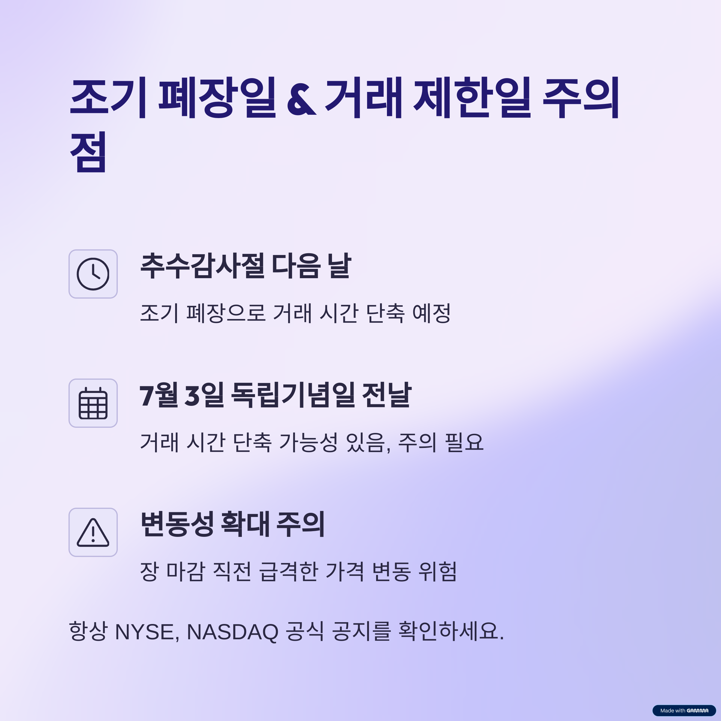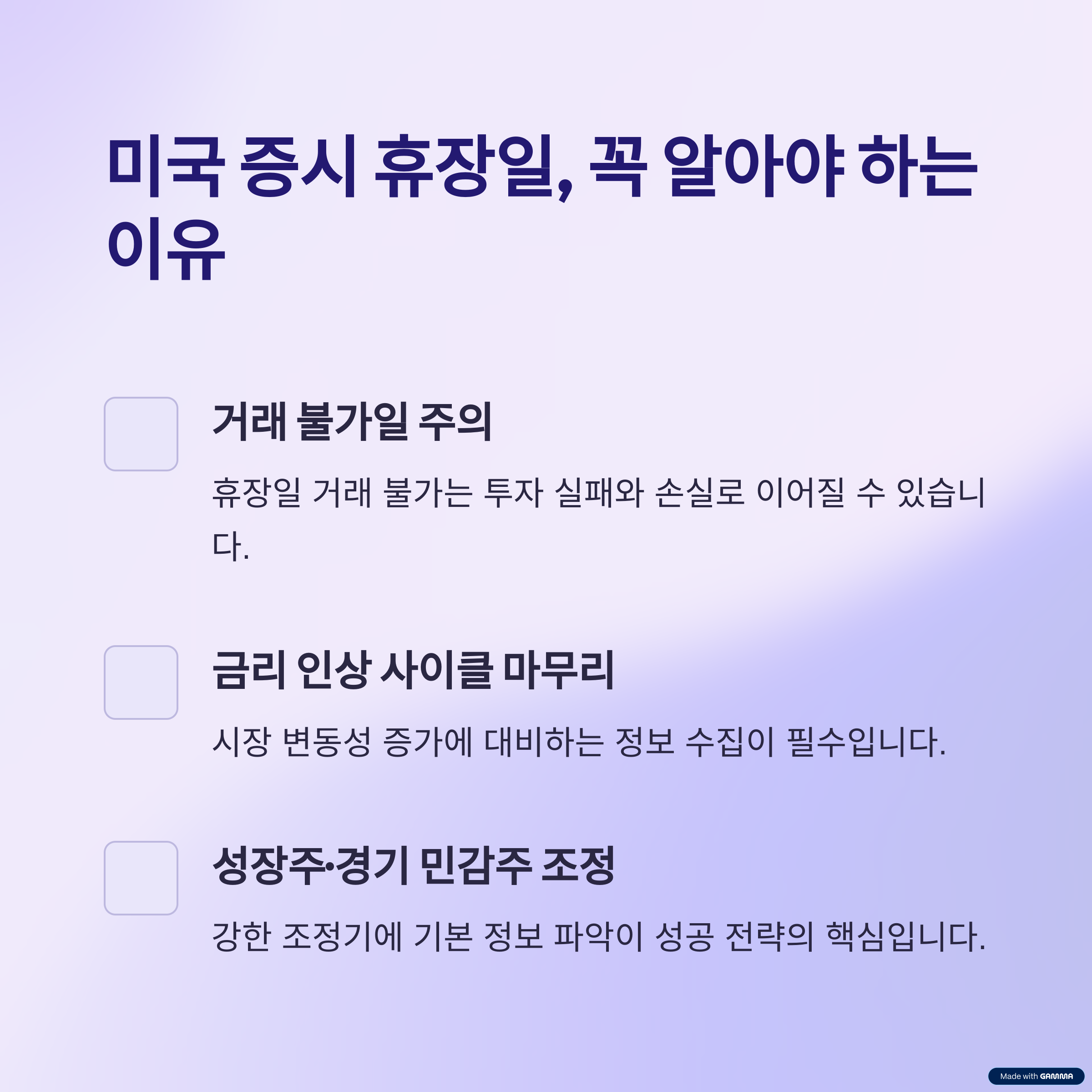 미국 증시에 투자할 때는 단순히 종목 선정이나 수익률뿐만 아니라, 정확한 거래일 파악도 성공적인 투자 전략의 핵심이 됩니다. 휴장일과 거래 제한일은 특정 날짜에 거래가 제한되거나 아예 불가능해지는 상황을 만들 수 있기 때문에 이로 인해 원하는 매수·매도 타이밍을 놓칠 수 있습니다. 실제로 많은 초보 투자자들이 이러한 일정 정보를 미처 확인하지 못해 손실을 경험하기도 합니다. 따라서 거래 전 반드시 해당일이 휴장일인지, 혹은 조기 폐장이 예정되어 있는지를 사전에 체크하는 습관이 필요합니다.