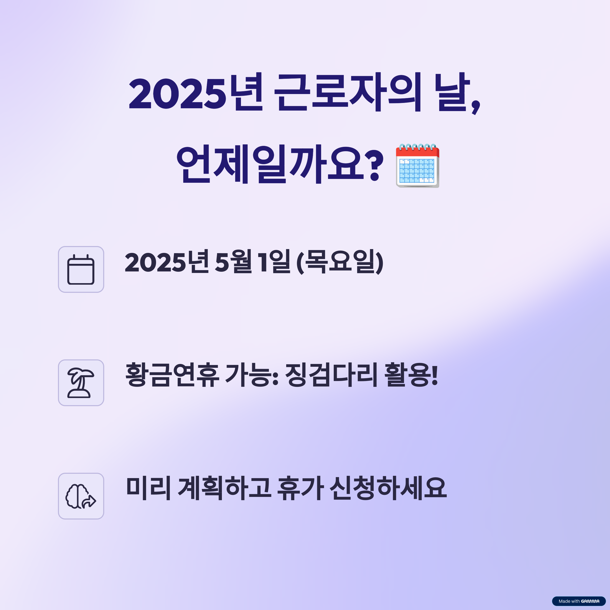 2025년 근로자의 날은 5월 1일 목요일입니다.