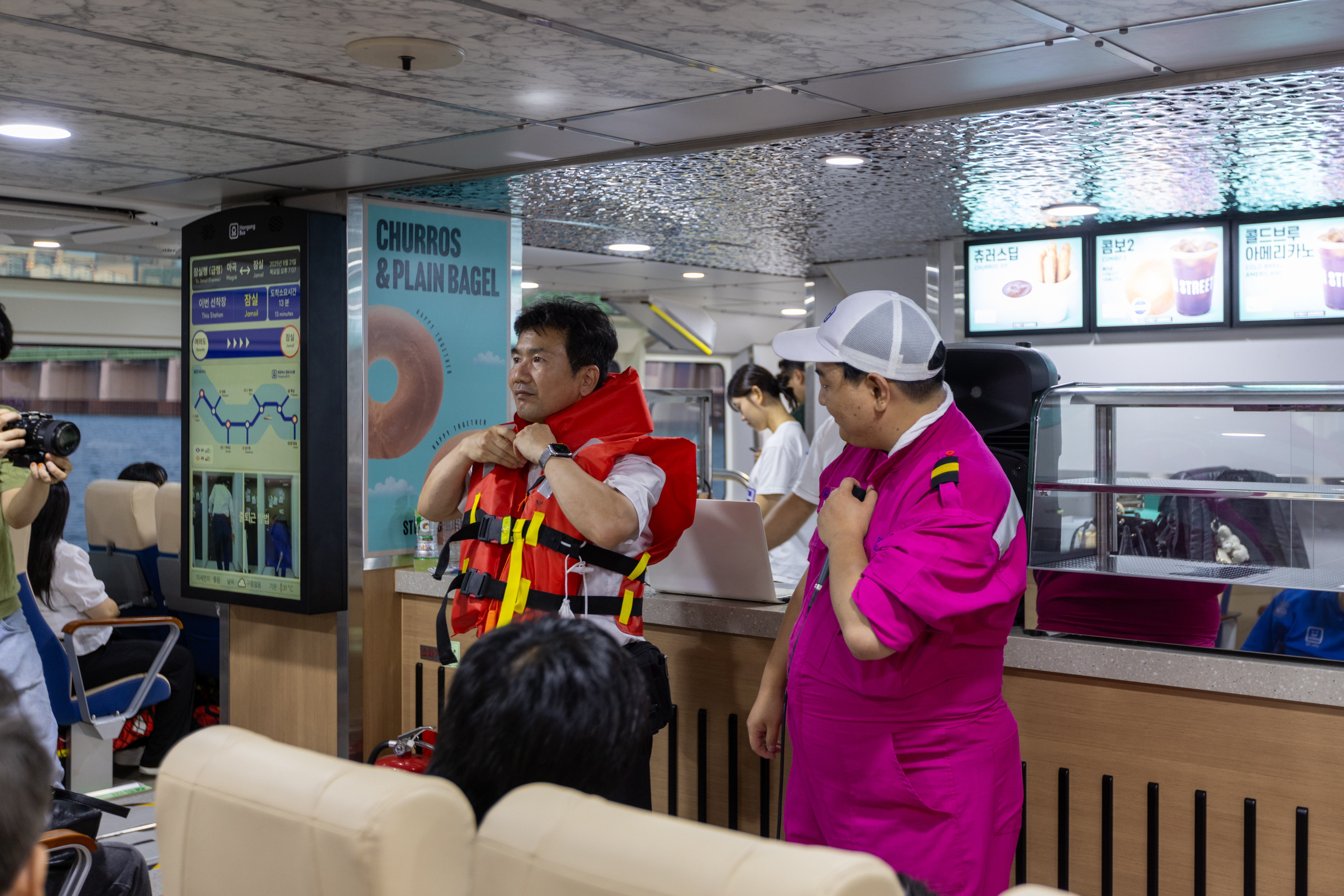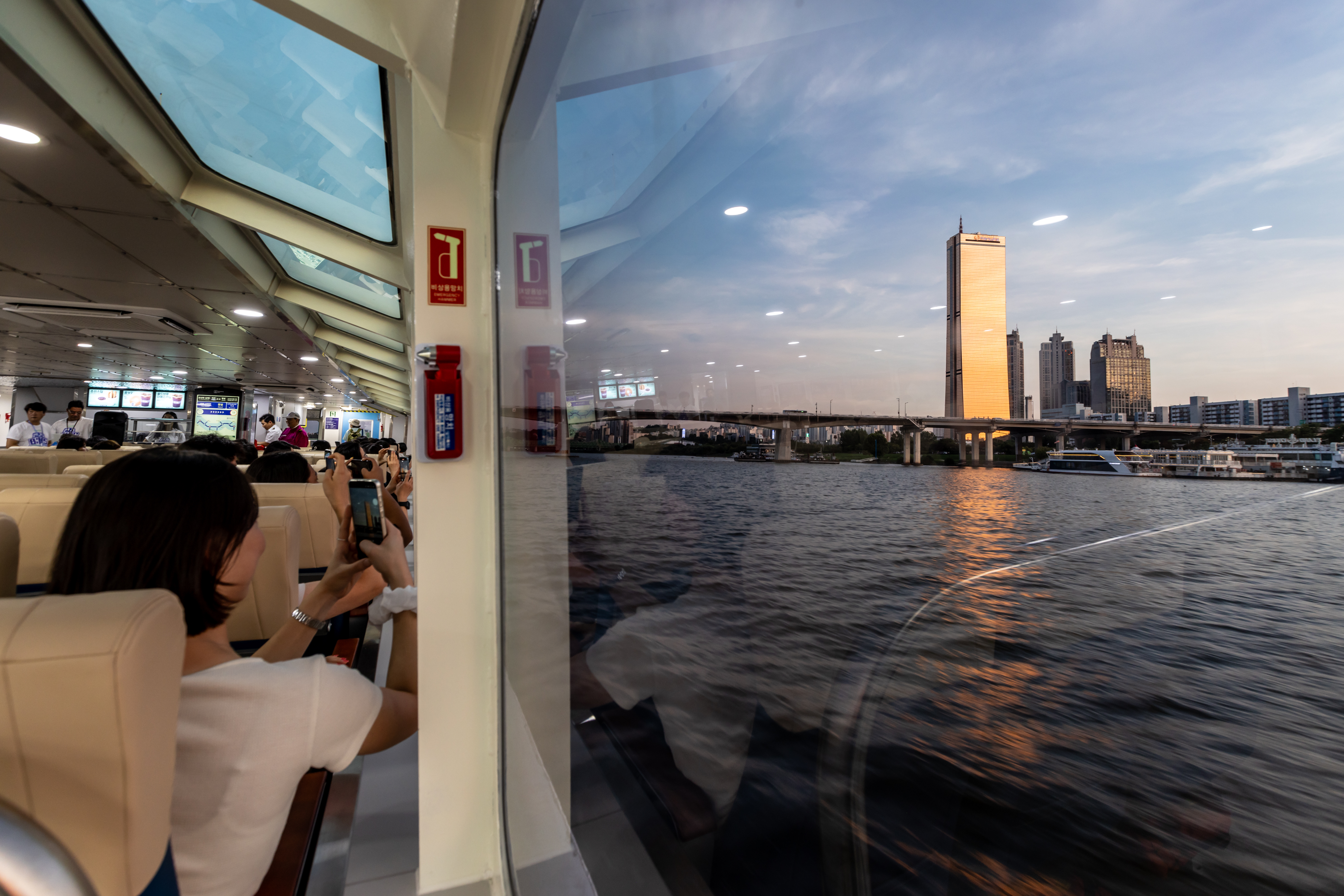 선내에서는 커피, 베이글, 츄러스 등 간단한 간식 구매도 가능하며, 주요 다리와 명소를 설명해주는 안내 방송도 운영됩니다.
