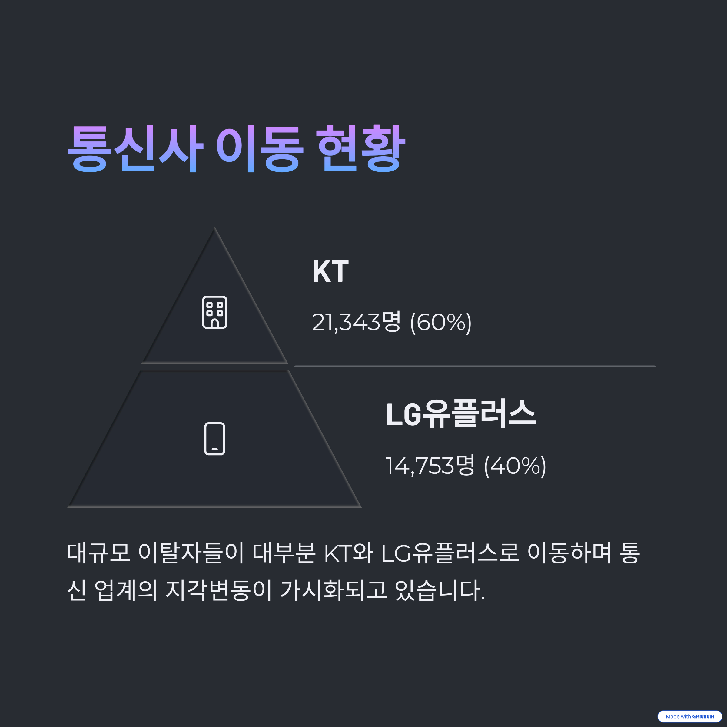 이 중 약 60%인 2만 1,343명이 KT로 이동하였고, 1만 4,753명은 LG유플러스로 옮겨갔습니다.